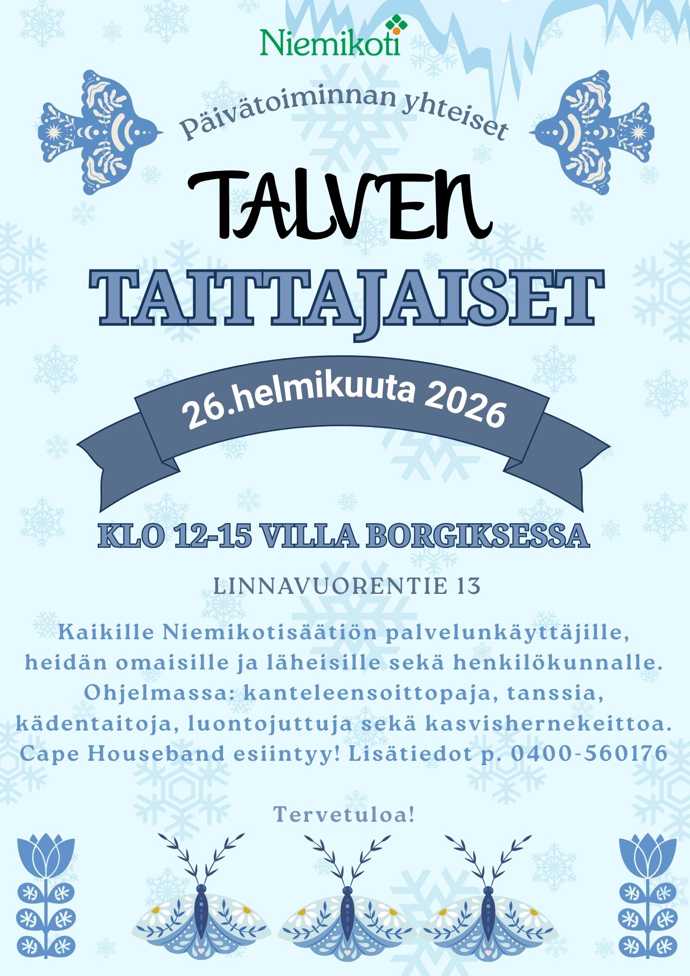 Koko Niemikotisäätiölle sekä läheisille ja omaisille avoimia Talven Taittajaisia juhlitaan torstaina 26.2. klo 12-15 toimintakeskus Villa Borgiksessa. Yhteislähtö Malmin päivätoimintakeskuksesta on klo 11. Tervetuloa mukaan!