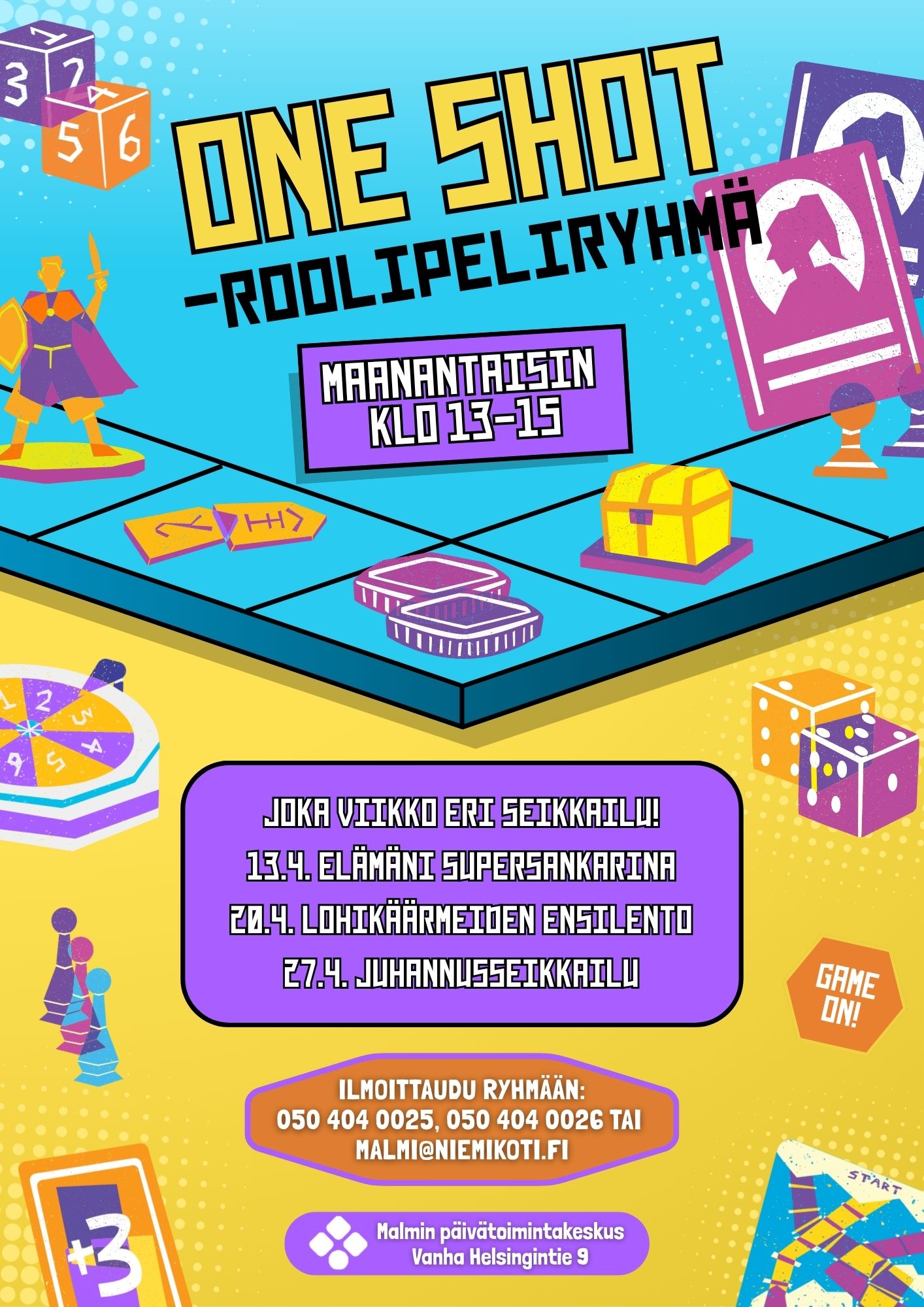 One shot -roolipeliryhmä maanantaisin klo 13-15. One shotit ovat kertaluonteisia lyhyitä yhdellä istumalla pelattavia roolipelejä. Voit tulla pelaamaan ilman aiempaa kokemusta tai omia noppia. Tule ja ihastu roolipelaamiseen! Mukaan mahtuu...