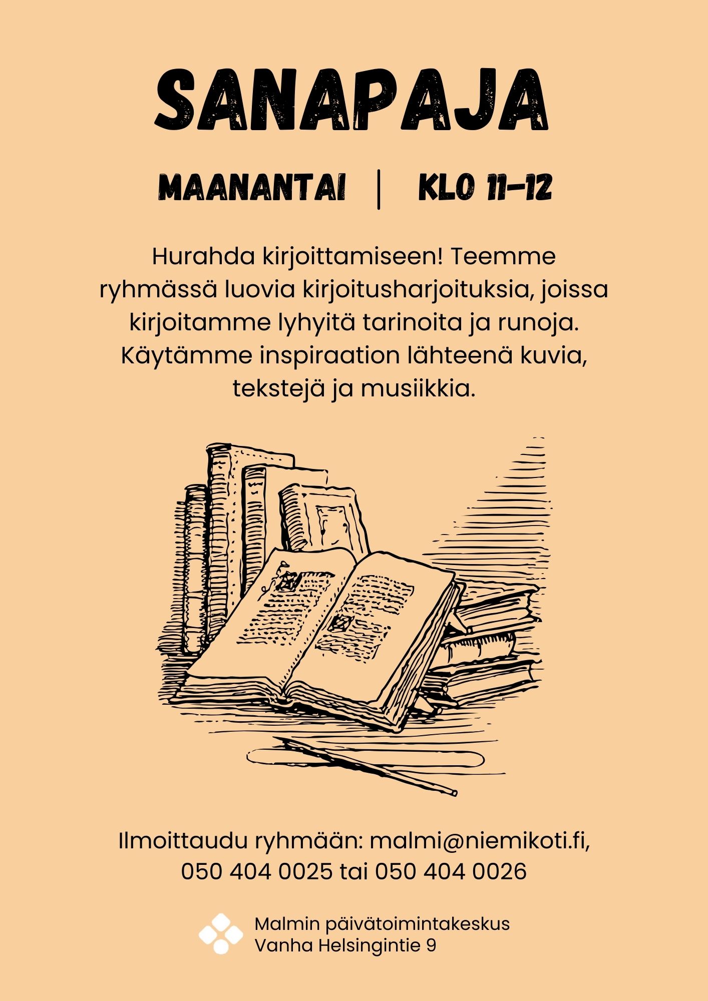 Apr 27 Sanapaja 11:00 - 12:00 Malmin päivätoimintakeskus Vanha Helsingintie 9, Helsinki Event Details Get Directions