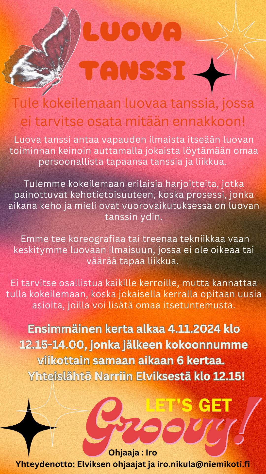 Vapauttavia ja rentouttavia luovan liikkeen harjoituksia. Tule löytämään eri tapoja liikkua ja parantamaan oman kehon tuntemusta.